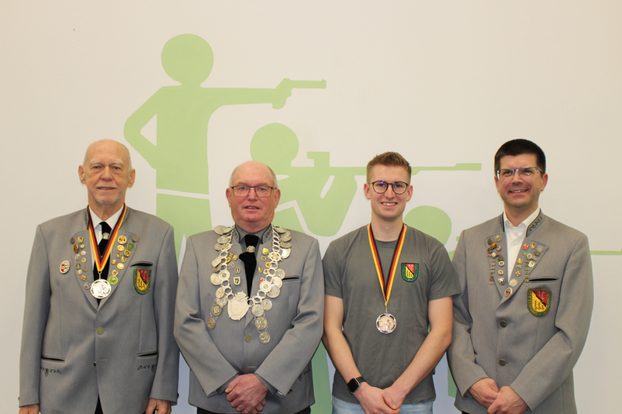 Von links nach rechts: Horst Holzinger (1. Ritter), Otto Messerschmidt (Schützenkönig 2025), Lucas Lenz (2. Ritter), Kai Hohenstein (Oberschützenmeister)